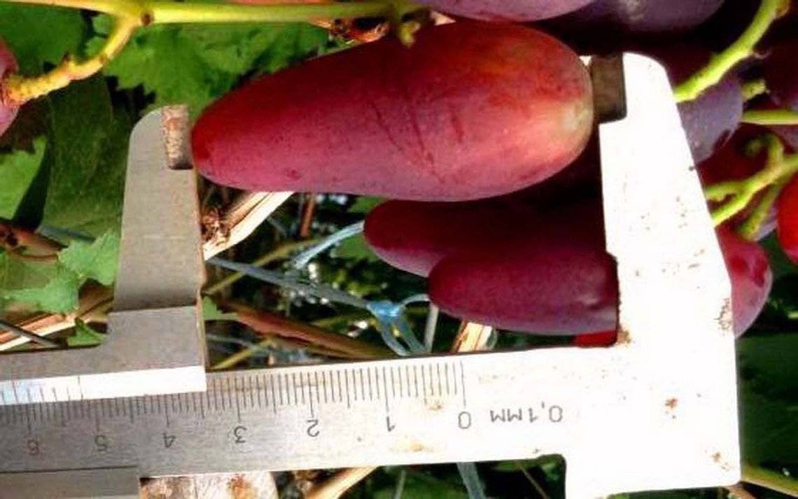 Удивляет и приводит в восторг, необычайно крупный размер виноградин (59×29 мм). Средний показатель веса одной виноградины варьируется в пределах 20 гр. Плоды выделяются оригинальной, конической формой, с выгнутым кончиком.