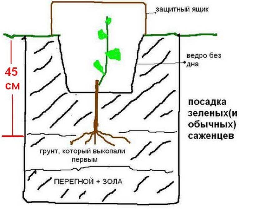 Сначала выройте траншею, которая имеет длину 6 метров. Стенки траншеи укрепите досками. Сажать черенки необходимо в предварительно вырытые ямы 60 см глубиной, длиной и шириной. Удобрите низ каждой ямы древесной золой и суперфосфатом. Поверх удобрения засыпьте гравий. Толщина слоя должна составлять 15 сантиметров. Последним слоем насыпьте грунт, смешанный с перегноем в пропорции 10:3.