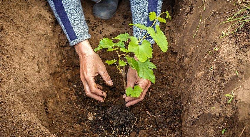Лозу можно высаживать в мае или июне, но зимостойкие сорта неплохо приживаются и осенью. Ряды кустов лучше ориентировать с севера на юг. Вдоль них формируются посадочные траншеи глубиной 60-70 см с вертикальными или наклонными краями. Грунт на дне траншеи перекапывается на 30 см, и удаляются сорняки. Затем вносятся удобрения, при этом на куст потребуется ведро перепревшего навоза, стакан древесной золы и 200 г суперфосфата.
