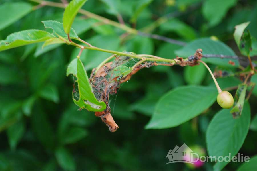 Гусеница на вишне длиной 5-6 мм, веретенообразная, красно-оранжевая, а в старшем возрасте перед окукливанием оливково-зеленого цвета и с черной головой. Куколка коричневая, в белом коконе, длиной 5 мм. Зимуют гусеницы в паутинных коконах в трещинах коры. С ранней весны повреждают почки, цветки и молодые листья, стягивая их паутиной в комки.