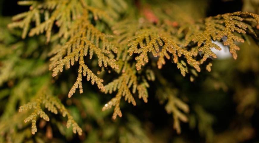 Золотисто-бронзовый окрас хвои в зимние месяцы приобретают видовые растения туи западной (Thuja occidentalis) и туи складчатой (T. plicata). Хвоя сортов Brabant, Columna и Holstrup лишь слегка окрашивается в коричневый цвет, а красивая, пышная хвоя сорта Smaragd даже при сильных морозах сохраняет свой насыщенно-зеленый оттенок. Потемнение или же побурение хвои туи – своеобразная защитная реакция на похолодание и приспособление к холодным зимам, которые господствуют на ее родине – в западной и восточной части Северной Америки.