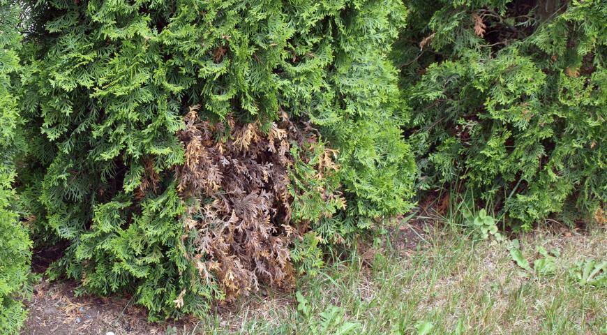 Неблагоприятные условия, которые вызывают пожелтение и осыпание хвои, засыхание ветвей нижнего яруса и гибель туи: