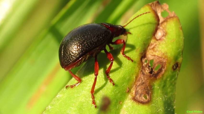 В начале лета личинки вредителя листоеда созревают к дальнейшему окукливанию, и укрываются под землей, чтобы там превратиться в молодых жуков. Теперь уже в новом обличье они вновь направляются к калине, но в этот раз не для того, чтобы поедать мякоть листьев, а прогрызать в них отверстия.