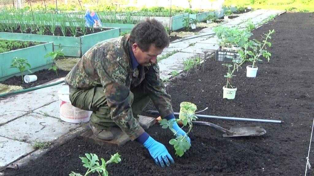 Как правило, рассаду арбузов и дынь огородники высаживают в теплицу в начале июня. Для этого делаем лунки, проливаем их теплой водой и высаживаем растения. Присыпаем землей, слегка придавливая грунт.