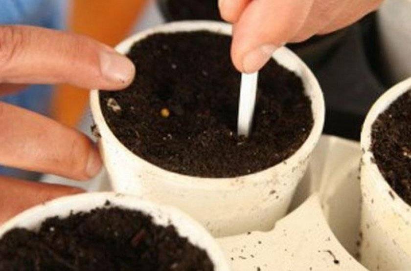 - С пикировкой в разовые стаканчики. Семена углубляют в землю на 2 см. Стаканчики накрывают стеклянными банками и создают температуру +25 °С, когда ростки покажутся из грунта, банки снимают. При наличии 2–3 листочков рассаду пересаживают методом перевалки в ёмкости (4–5 л), где они в дальнейшем будут развиваться.