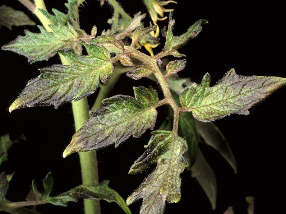 - При нехватке азота: кусты высокорослых томатов становятся светло-зелеными, сверху листья не закручиваются.